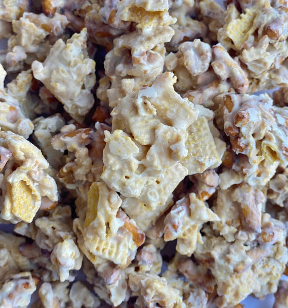 This irresistible snack mix combines pretzels, salted nuts, and corn squares with a sweet coating.