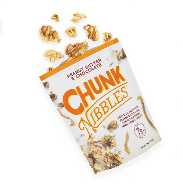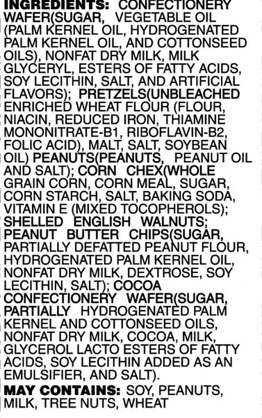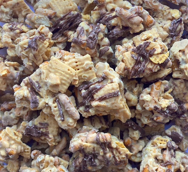 A delicious combination of pretzels, salty nuts, corn chex, and creamy peanut butter chips topped with a milk chocolate drizzle.