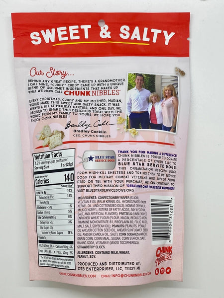 “Treat yourself to this delicious blend of our classic Chunk Nibbles recipe and strawberry bits that will have you asking; ‘WHERE HAS THIS BEEN ALL MY LIFE?!’ Nothing will satisfy that sweet tooth and snack craving like our Strawberry Chunk Nibbles! This is a limited edition so be sure to get them while you can!”