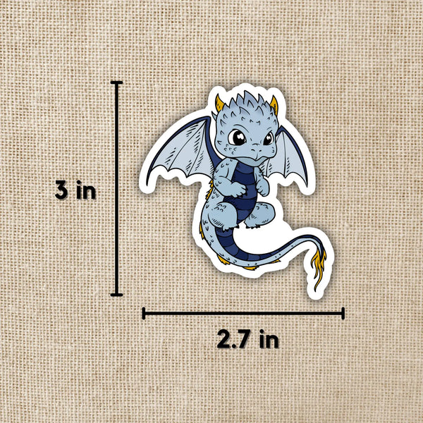 Sticker of a precious flying baby dragon with blue scales and yellow spikes and horns.